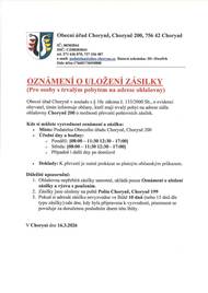 Pošta Choryně - dočasná změna hodin pro veřejnost. Středa 8.4.2026 14:00 - 17:00 hod. Po stanovených hodinách je možné podávat zapsané zásilky na poště Valašské Meziříčí.