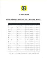 Rozpis fotbalových utkání jaro 2026 – Muži 7. liga skupina A. Může dojít ke změnám, doporučujeme stáhnout si aplikaci FotbalCZ do mobilu.