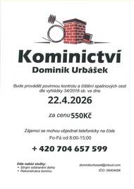 V období od 13. února do 6. března 2026 bude ve vaší obci probíhat pravidelná kontrola komínů a čištění kouřovodů. V případě zájmu o tuto službu nás prosím kontaktujte na telefonním čísle 739 239 937. Miroslav Majíček Certifikovaný – vyučený kominík www.kominikzlin.cz