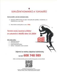 Požadované kontroly a čištění komínů pro plyn i tuhá paliva. Čištění komínů: 450 Kč Revize kotlů na tuhá paliva: 1.300 Kč Dále nabízí levné vložkování a frézování komínů, výchozí-kolaudační revize. Zájemci se mohou objednat na telefonním čísle: 608 748 989.