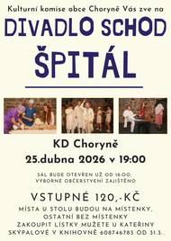 25. 4. 2026 divadlo Schod z Valašského Meziříčí představí hru Špitál. Občerstvení zajištěno. Vstupenky si můžete zakoupit u Kateřiny Skýpalové v knihovně nebo si je rezervovat telefonicky na čísle 608 746 783.