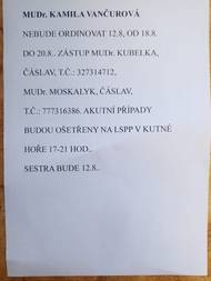 MUDr. Vančurová neordinuje 12.8., od 18.8.-20.8.2025