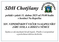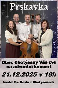Vážení občané, srdečně Vás zveme na adventní koncert hudebního seskupení Prskavka, který se bude konat 21.12.2025 od 18 hodin v kostele sv. Havla v Chotýšanech. Po skončení bude před kostelem tradičně připraveno svařené víno, čaj a drobné občerstvení. Přijďte se naladit na nadcházející vánoční svátky.