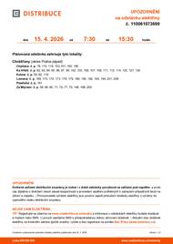 Dne 15.4.2026 proběhne plánovaná odstávka elektřiny - týká se těchto č.p. : Chýňská 78, 115, 118, 153-157, 160, 195 , Ke Hřišti 82, 83, 84, 95, 96, 97, 99, 102, 105, 106, 107, 108, 111, 112, 114, 125, 127, 130, Kolmá 59, 62,119, Lomená 169, 170, 172, 173, 176, 179, 180, 190, 192, 193, 194, 201, 208, Plzeňská 161, Za Mlýnem 56, 60, 65, 71, 74, 77, 79, 148, 168, 259