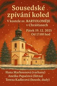 Srdečně zveme všechny sousedy a sousedky z Chrášťan a okolí na zpívání koled do kostela sv. Bartoloměje v Chrášťanech, v pátek 19.12.2025 od 17:00hod. Přijďte nasát sváteční atmosféru, společně pobýt a zastavit se v předvánočním shonu. Po zpívání budou před kostelem připravené teplé nápoje. Zpívání pro nás připravily - Hana Marhounová, Tereza Kadlecová a Anežka Papačová.