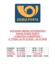 Česká pošta - pobočka Chrášťany - informuje, že z provozních důvodů bude 31.12.2025 otevřeno od 08:00 - 10:00hod.