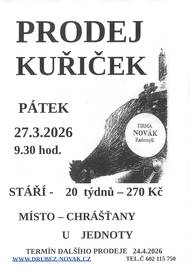 V pátek 24.04.2026 v 09:30 hod., se před nákupním střediskem v Chrášťanech, uskuteční prodej kuřiček. Firma Novák Radomyšl prodává nosné kuřice - červené, kropenaté, černé, bílé, modré, žíhané, vlašky. Stáří 20 týdnů - cena 300,- Kč. Kontakt: www.drubez-novak.cz, tel. 602 115 750. Termíny předpokládaného rozvozu pro rok 2026 : 24.04. / 22.05. / 19.06. / 17.07. / 14.08. / 11.09. / 09.10. / 06.11.