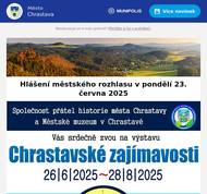Zveme Vás na CHRASTAVSKÉ SLAVNOSTI 2025, které se uskuteční ve dnech 6.-8. 6. 2025. Kompletní program naleznete na webu města v aktualitách. ČEZ oznamuje plánovanou odstávku el. energie dne 9. června 2025 od 9:30 do 14:30 hod. v části obce:Andělská Hora 3,5,6kat. území AH u Chrastavy: parcelní č. 120/1, 120/26
