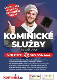 Sdružení kominíků a topenářů bude provádět v naší obci v neděli 19. dubna kontrolu a čištění komínů pro plyn i tuhá paliva dle vyhlášky č. 34/2016 Sb. a č. 320/2015 Sb. za cenu 450,- Kč. Revizi kotle na tuhá paliva za cenu 1300,- Kč. Zájemci se mohou objednat telefonicky na čísle 608 748 989