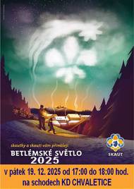 Betlémské světlo přinášejí skauti v pátek 19.12.2025 od 17 do 18 hodin na schody KD Chvaletice.