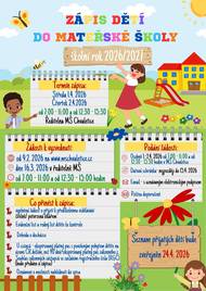 Zápis dětí do mateřské školy ve středu 1.4.2026 a ve čtvrtek 2.4.2026 od 7:00 - 11:00 hodin a od 12:30 - 15:30 hodin.