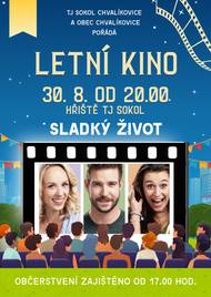TJ Sokol Chvalíkovice a Obec Chvalíkovice Vás srdečně zve na promítání filmu Sladký život. Sobota 30. srpna 2025, od 20.00 hod. Občerstvení zajištěno od 17.00 hod.