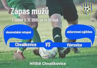 Přijďte v neděli 2. 11. 2025 od 14.00 hod. podpořit naše fotbalisty a užít si příjemné sportovní odpoledne.