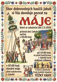 SDH Jakub si Vás dovoluje pozvat na Máje, které se uskuteční 2. 5. 2026. Stavění Máje bude v 7 hodin před sokolovnou v Jakubě. Průvod částí obce Jakub začíná v 9 hodin. Od 19 hodin před hasičárnou v Jakubě se koná Májová zábava. K poslechu a tanci hraje skupina Těžký Váhy.