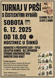 V sobotu 6.12. od 18h pořádají v hostinci U Šimků čistečtí rybáři Turnaj v prší s rybářskými kartami.