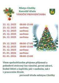 Dovolujeme si Vás informovat o dočasné změně hodin pro veřejnost provozovny pošty Cítoliby, ul. Zeměšská čp. 219. Rozsah hodin pro veřejnost bude omezen na nezbytně nutnou dobu v období vánočních svátků od 24.12. - 2.1.2026, a to z provozních důvodů.