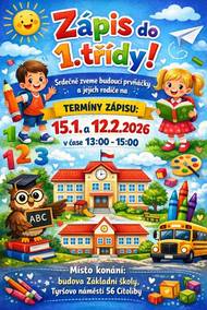 Vážení rodiče budoucích prvňáčků, srdečně Vás a Vaše děti zveme 15.1. a 12.2.2026 k zápisu do 1. ročníku naší školy pro školní rok 2026/2027. Místo konání: budova ZŠ, Tyršovo náměstí 56, Cítoliby.