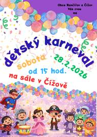 Obec Rančířov a Čížov, Vás zvou na DĚTSKÝ KARNEVAL v sobotu 28. 2. 2026 od 15:00 hodin se na vás budeme těšit. Pozor, tentokrát se koná na sále v Čížově!