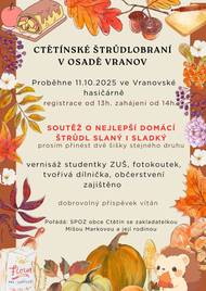 SPOZ obce Ctětín se zakladatelkou Míšou Markovou a její rodinou Vás srdečně zvou na "CTĚTÍNSKÉ ŠTRŮDLOBRANÍ V OSADĚ VRANOV", které se koná dne 11.10.2025 ve Vranovské hasičárně. Soutěžií se o NEJLEPŠÍ DOMÁCÍ ŠTRŮDL_SLANÝ i SLADKÝ. Registrace soutěžících je od 13:00 hod. Zahájení od 14:00 hod. Těšíme se na Vás