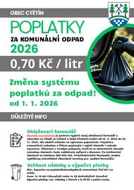 Všem kdo ještě nezaplatili poplatky za odpad, připomínáme povinnost platby do 30.9.2025. Důležité upozornění. Poplatky na rok 2026, budou vybírány na základě výměru a to v roce 2027. Vlastníci nemovitostí v obci Ctětín mají povinnost podat ohlašovací formulář v období od 16.9. do 25.11.2025.