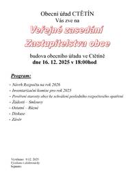 Obecní úřad Ctětín Vás zve na Veřejné zasedání Zastupitelstva obce, které se bude konat v budově obecního úřadu ve Ctětíně, dne 16.12.2025 od 18:00hod.