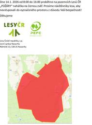 Dne 14.1. 2026 od 8:00 do 16:00 proběhne na pozemcích Lesů ČR „POŽÁRY“ naháňka na černou zvěř. Prosíme návštěvníky lesa, aby nevstupovali do vyznačeného prostoru z důvodu Vaší bezpečnosti! Děkujeme, Lesy České republiky, s.p. (Lesní správa Nasavrky)