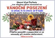 Obecní úřad Čtyřkoly zve všechny dříve narozené na vánoční posezení. Přijďte si popovídat a posedět se sousedy při malém občerstvení ve středu 11. prosince od 17 hodin v prvním patře úřadu. Těšíme se na Vás!