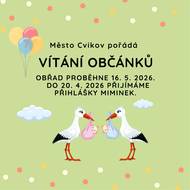 Město Cvikov ve spolupráci s Komisí pro občanské záležitosti pořádá obřad pro uvítání nově narozených dětí. Pokud máte zájem své děťátko slavnostně uvést mezi občany našeho města, zašlete přihlášku na e-mail: mesto@cvikov.cz Přihlášku lze odevzdat i na podatelně MÚ. Prosíme o nahlášení účasti nejpozději do 20. 4. 2026. Přihlášení rodiče obdrží písemnou pozvánku.