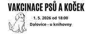 VAKCINACE PSŮ Dne 1. 5. 2026 v době od 18:00 proběhne pravidelná každoroční vakcinace psů. Cena vakcinace: Vzteklina – 200 Kč Kombinovaná vakcína – 400 Kč (vzteklina, psinka, parvoviróza, infekční laryngotracheitida, inf. zánět jater, leptospiróza, psincový kašel) + možnost zakoupit tabletky na odčervení psů a koček a přípravky proti klíšťatům a blechám (tabletky - Bravecto, Simparica, kapičky nebo obojky - jen na objednání) Místo konání: Dalovice - u knihovny (Hlavní 99) Povinnost vakcinace psů proti vzteklině vyplývá ze zákona č. 166/99 Sb., o veterinární péči!! MVDr. Ludík Miroslav Tel. 605 823 121 KVL 5757 Ostrov, Husova 32 Po, St, Čt 13.00 -16.00 Pá 16.00 - 18.00 So 8.00 – 10.00 K.Vary, Tašovice, Úzká 37 Po 17.00 - 18.00 Út 8.00 - 11.00, 13.00 - 15.30
