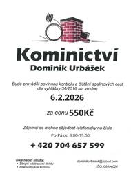 Bude dne 6.2.2026 v naší obci provádět kontrolu a čištění spalinových cest, cena 550 Kč. Zájemci se mohou objednat telefonicky na čísle: 704 657 599.Více na letáku.