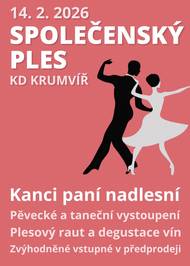 Spolek proKrumvíř vás srdečně zve na Společenský ples, který se koná v sobotu 14.2.2026 v KD v Krumvíři. Od 20:00 hodin se můžete těšit na kapelu Kanci paní nadlesní, baletní a pěvecké vystoupení, tombolu a bar s míchanými nápoji. V ceně vstupenky je degustace vín a plesový raut.