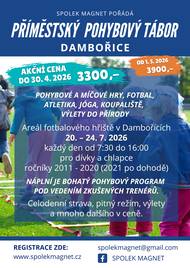 Spolek Magnet pořádá PŘÍMĚSTSKÝ POHYBOVÝ TÁBOR v areálu fotbalového hřiště v Dambořicích. Termín: 20.7. - 24.7.2026. Více informací na letáku.