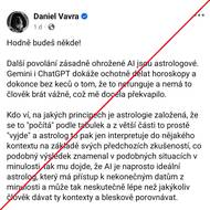 Daniel Vávra ve svém facebookovém postu tvrdí, že astrologové jsou dalším povoláním zásadně ohroženým umělou inteligencí. Na první pohled to může znít jako vtipná poznámka o tom, že chatbot zvládne vyplodit horoskop stejně ochotně jako člověk. Jenže způsob, jakým je tento závěr vystavěn, stojí na ně