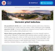 Před 8 dnyOd pondělních 20:00 platí v celém Děčíně výstraha před silnou ledovkou, která představuje vysoké riziko pro chodce i řidiče. Nebezpečí potrvá až do úterních 12:00. V ranních hodinách se očekává mrznoucí déšť a vznik silné ledovky, jejíž tloušťka může přesáhnout 2 mm. Město Děčín proto přijalo řadu opatření ke zmírnění dopadů nepříznivého počasí. Základní a mateřské školy obdrží během pondělí zásoby soli a štěrku pro posyp. Již v úterý ve 3:00 vyrazí do ulic traktory Střediska městských služeb a od 5:00 se k nim připojí také padesát pracovníků SMS, kteří zajistí posyp komunikací a další bezpečnostní práce. V úterý budou rovněž uzavřeny městské hřbitovy, s výjimkou hřbitova Škrabky. Obyvatelům města doporučujeme omezit pohyb venku na nezbytné minimum. Pokud to situace dovolí, je vhodné nevycházet z domu a jízdu autem omezit pouze na opravdu nutné případy.- Před 8 dny