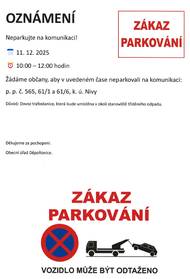 Žádáme občany, aby v úterý 11. prosince 2025 v čase od 10:00 do 12:00 hodin neparkovali na komunikaci p. p. č. 565, 61/1 a 61/6, k. ú. Nivy. Zákaz parkování je zaveden z důvodu dovozu trafostanice, která bude umístěna v okolí stanoviště tříděného odpadu.