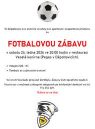 TJ Děpoltovice zve srdečně všechny své sportovní i nesportovní příznivce na FOTBALOVOU ZÁBAVU, která se koná v sobotu 24. ledna 2026 ve 20:00 hodin v restauraci Veselá konírna (Pegas v Děpoltovicích).