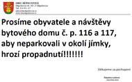 Obec Děpoltovice vyzývá obyvatele a návštěvy bytového domu č. p. 116 a 117, aby neparkovali v okolí jímky. V této oblasti hrozí nebezpečí propadnutí, a proto je důležité dbát na toto upozornění pro ochranu zdraví a bezpečnost.