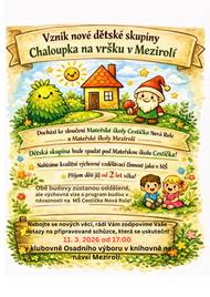 V Mezirolí se otevírá nová dětská skupina Chaloupka na vršku, která bude pod správou Mateřské školy Cestička Nová Role. Skupina se zaměří na kvalitní výchovně vzdělávací činnost pro děti již od 2 let.