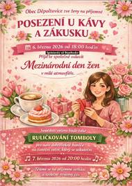 Obec Děpoltovice zve ženy na příjemné posezení u kávy, které se uskuteční 6. března 2026 od 18:00 hodin. Přijďte společně oslavit Mezinárodní den žen v milé atmosféře.