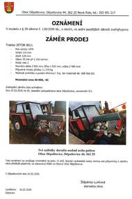 Obec Děpoltovice oznamuje záměr prodeje traktoru ZETOR 8011. Traktor je vyroben v roce 1974 a jeho minimální cena činí 50 000 Kč. Zájemci mají možnost prohlídky a kontaktování Ing. Jana Kubernáta pro více informací.