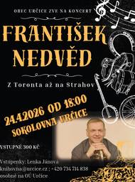 Obec Určice vás zve na koncert Františka Nedvěda 24.4.2026 od 18 hod. v sokolovně v Určicích. Vstupné 300 Kč. Prodej u paní Jánové na OÚ Určice, tel. 734 714 383