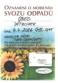 Respono, a.s. oznamuje občanům, že vzhledem k velikonočním svátkům proběhne svoz směsného komunálního odpadu v sobotu 11. dubna 2026. Dále Obecní úřad Dětkovice upozorňuje občany, že pokud nebude na nádobě vylepena aktuální platná známka, nebude svoz proveden!