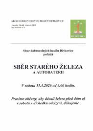 SDH Dětkovice oznamuje občanům, že v sobotu 11. 4. 2026 proběhne v naší obci od 9.00 hodin SBĚR STARÉHO ŽELEZA a AUTOBATERIÍ.
