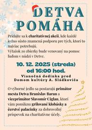 Před 1 měsícemDetva pomáha - pridajte saUž dnes (streda 10. decembra) od 16.00 hod. sa vo Vianočnej dedinke pred Domom kultúry A. Sládkoviča stretneme pri krásnej myšlienke – pomôcť ľuďom v núdzi u nás v Detve. Primátor Branislav Baran a viceprimátor Slavomír Ciglan budú pre vás pripravovať grilované klobásky a čerstvé palacinky. Stačí dobrovoľný príspevok – každé sústo bude mať zmysel. 🍴✨ Príďte sa zahriať dobrou náladou, vôňou Vianoc a podporou tých, ktorí to najviac potrebujú. ❤️🤝
