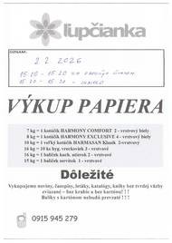 Firma Ľupčianka,s.r.o. ponúka pravidelný výkup papiera. Vykupuje sa bežný papier z domácnosti ako časopisy, noviny,kancelársky papier, katalogy, letáky, knihy bez tvrdej väzby zviazaný špagátom nie v kartónovej krabici alebo igelitke. Balíky nesmú obsahovať kartón,lepenku,umelé hmoty,kovové časti a iné nečistoty. Termín: 2.2.2026 (Pondelok) 15:00 - 15:20 Obecný úrad 15:20 -15:30 Ihrisko Ďakujem.
