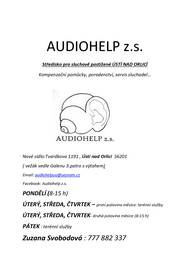 AUDIOHELP z.s. Středisko pro sluchově postižené ÚSTÍ NAD ORLICÍ Kompenzační pomůcky, poradenství, servis sluchadel… Nové sídlo:Tvardkova 1191 , Ústí nad Orlicí 56201 ( vežák vedle Galenu 3.patro s výtahem) Email: audiohelpuo@seznam.cz Facebook: Audiohelp z.s. PONDĚLÍ (8-15 h) ÚTERÝ, STŘEDA, ČTVRTEK – první polovina měsíce: terénní služby ÚTERÝ, STŘEDA, ČTVRTEK- druhá polovina měsíce (8-15 h) PÁTEK : terénní služby Zuzana Svobodová : 777 882 337 Komletní informace naleznete v příloze: