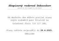 Skupinový vodovod Dobrochov Dne 24.11.2025 od 16:30 - 17:30 se bude vybírat v zasedací místnosti obce vodné za 5-10/2025. Pro informace o bezhotovostní platbě volejte na tel. 733 117 144 - pí Vrtalová.