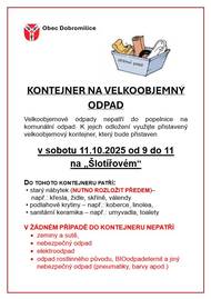 Hasiči Dobromilice informují, že v sobotu 11.10. od 8:30 provedou sběr starého železa a vysloužilých elektrospotřebičů. S těžkým železem a elektrospotřebiči pomůžou. Obec Dobromilice oznamuje, že v sobotu 11.10. od 9 do 11 bude na Šlotířovém přistaven kontejner na velkoobjemný odpad. Do toho kontejneru patří např. starý nábytek jako křesla, skříně, válendy, podlahové krytiny či sanitární keramika. V žádném případě do kontejneru nepatří zemina a suť, nebezpečný odpad, elektroodpad, odpad rostlinného původu a bioodpad, eternit a jiný nebezpečný odpad jako např. pneumatiky