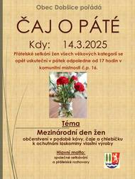 Obec Dobšice Vás zve na přátelské posezení do komunitní místnosti č.p. 16 v pátek 14.3.2025 od 17 hodin na čaj o páté na téma oslavy Mezinárodního dne žen.