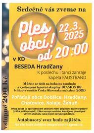 Srdečně Vás zveme na Ples obcí v KD Hradčany dne 22.3.2025 od 20 hodin. Vstupné 200 Kč, bohatá tombola a autobusový svoz zajištěn.